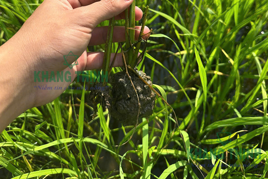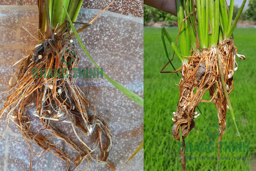Triệu chứng: rễ lúa có các bướu, thường nhất ở chót rễ hoặc có thể gặp ở bất kỳ vị trí nào trên rễ. Cây lúa kém phát triển, vàng lá, giảm đẻ nhánh. Trường hợp bị nặng, bụi lúa lùn, lá lúa vàng và chết khô.